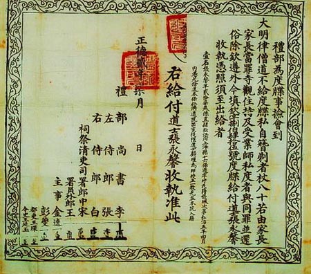 在古代,“出家”的内在条件具备后,即具有强烈的出家的主观愿望,还必须持有度牒。度牒是官府发给的用以证明僧尼合法身份的凭证,是被朝廷所认可的出家资格证明。度牒一般由尚书省下的祠部颁发,故亦称祠部牒。