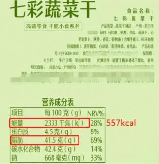 从它的营养成分表可以看到,其中的脂肪含量高达41.5g/100g,热量高达557kcal/100g。《中国居民膳食指南》中推荐,每天烹调油的摄入量为25~30g,蔬菜每天要吃300~500g。如果用蔬菜干代替蔬菜给孩子作为补充,那脂肪的摄入量几乎达到了120g以上,超出了指南推荐的4倍多,而过量脂肪的摄入会增加孩子肥胖的发病风险。