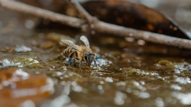 当蜜蜂不小心掉落到一池水中时,它们会拍动翅膀划水,在水面上制造出不对称的波浪,以此为动力把自己推到岸边。