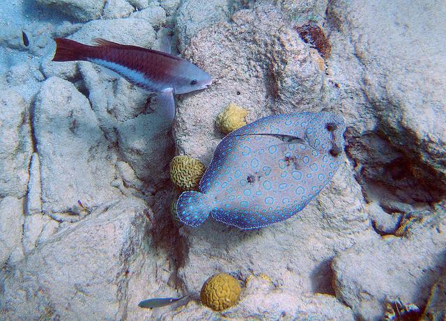 比目鱼一般喜欢潜伏在浅海的沙质海底,在身上覆盖一层沙子,只露出两只眼睛。一方面躲避敌人的侵袭,另一方面捕食小鱼虾。同一侧的两只眼睛能避免它们侧躺在海床上时,沙子进入眼睛,同时也形成了很好的伪装。