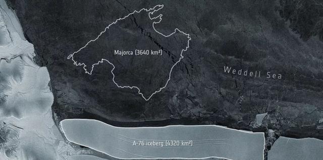 公报说,该冰山被命名为A-76,长约170千米,宽约25千米。它的面积超过同样位于威德尔海的A-23A冰山,成为目前世界最大的冰山。A-23A是此前最大的冰山,面积约3880平方千米。
